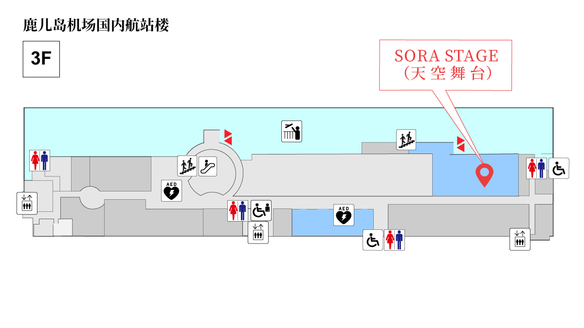 在国内航站楼,从观光综合问讯处乘坐最近的自动扶梯到2楼,正面就能看到SORA STAGE(天空舞台)的入口。